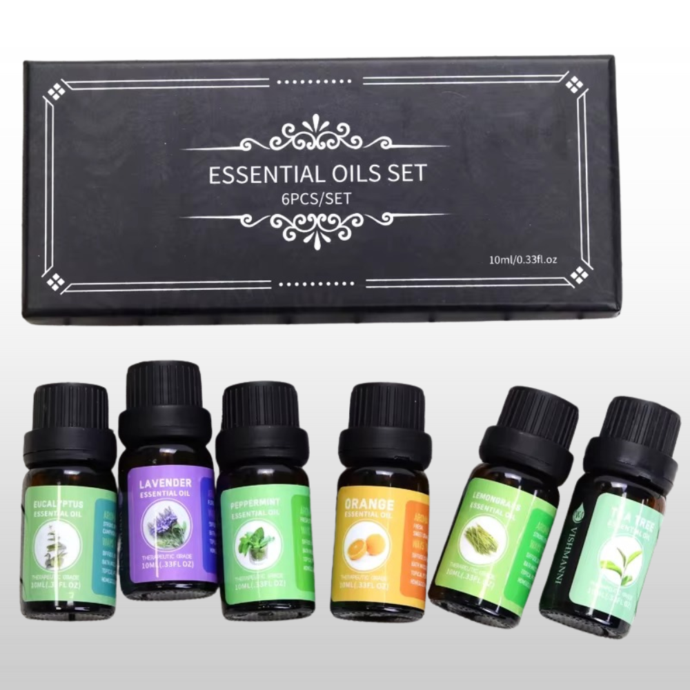 Bringe Harmonie und natürliche Frische in dein Zuhause – mit unserem Set aus sechs 100 % reinen ätherischen Ölen.